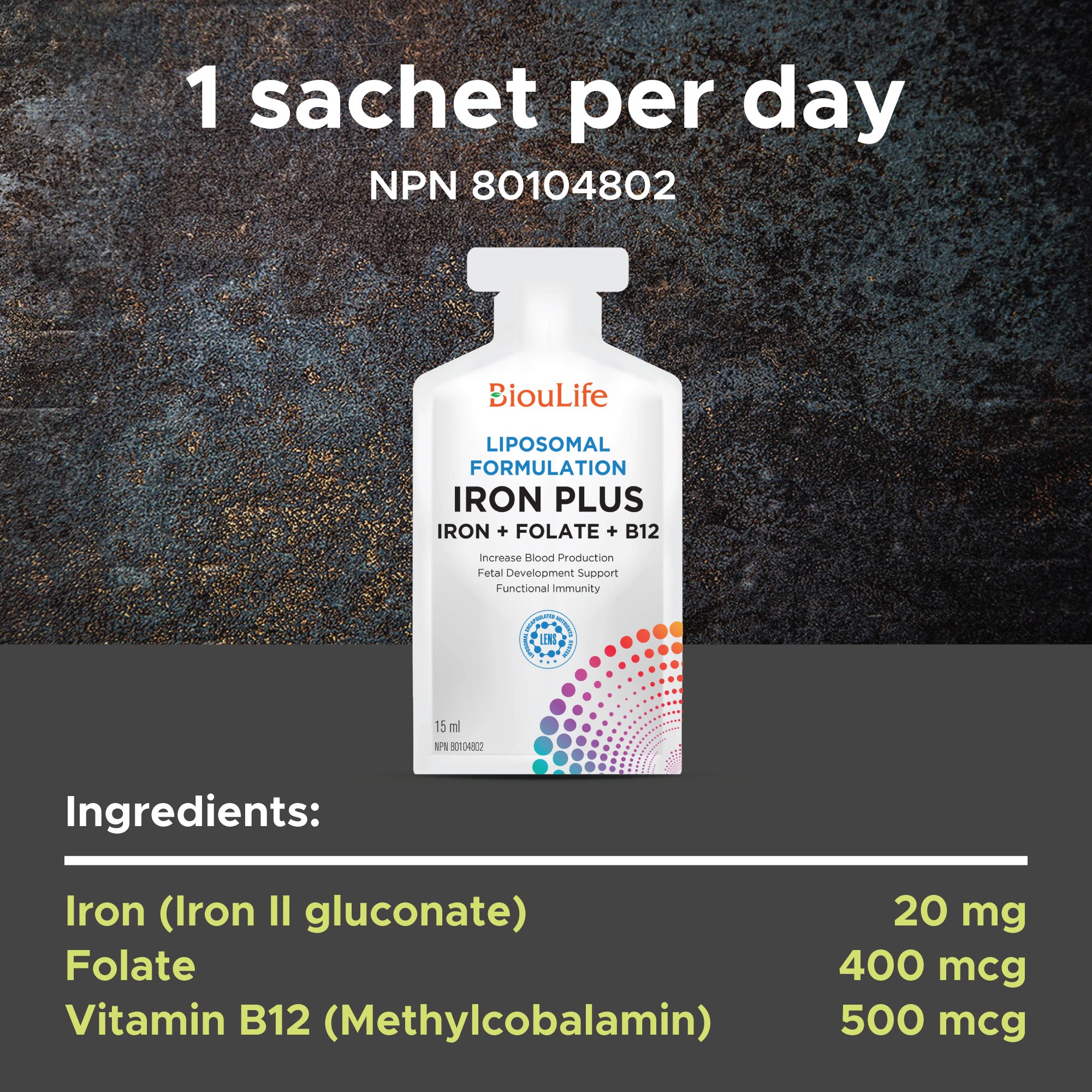 Main Ingredients: Iron (Iron II Gluconate) 20mg, Folate 400mcg, Vitamin B12 (Methylcobalamin) 500mcg
