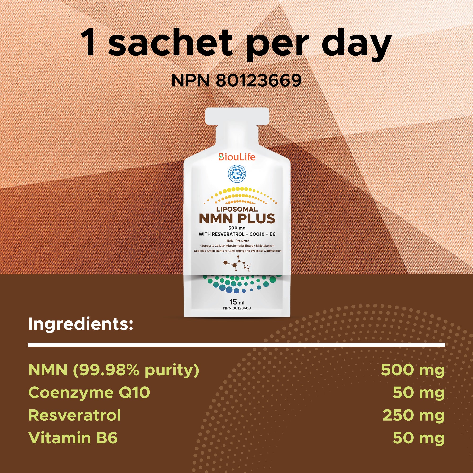 Main Ingredients: NMN (nicotinamide mononucleotide 99.98% purity) 500 mg, Coenzyme Q10 50 mg, Resveratrol 250 mg, Vitamin B6 50 mg