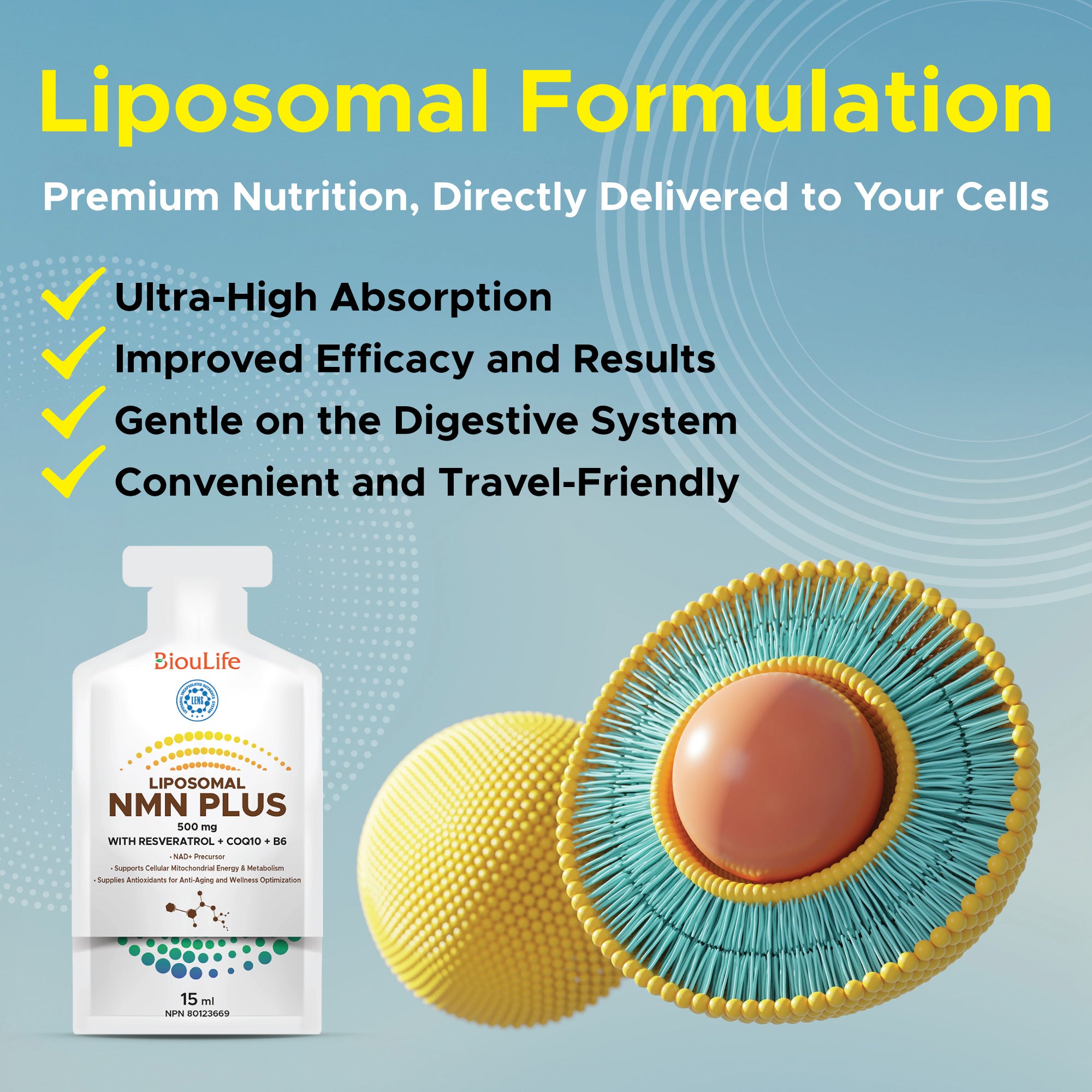 metabolism. However, due to the low natural absorption rate of NMN, only a small portion will get where it should be when taken with regular NMN supplements. Thus, liposomal NMN Plus was born, which ensures that this vital nutrient is properly absorbed and delivered to its target cells.